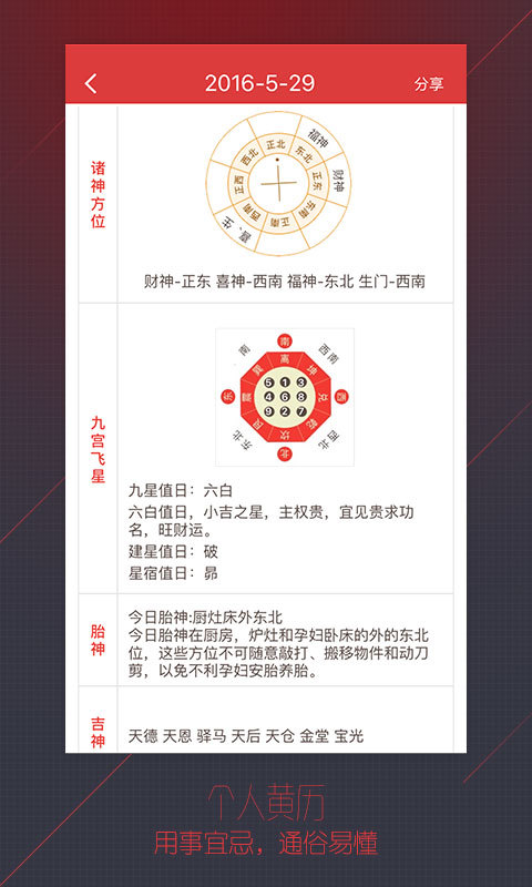 1、黃歷:教你輕松學(xué)會(huì)擇吉!今日宜忌、神煞方位、值日星神、時(shí)辰吉兇、九宮飛星、風(fēng)水方位,一目了然!