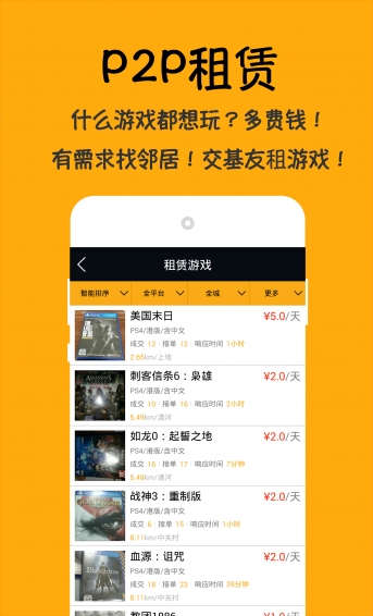 3.點(diǎn)對點(diǎn)租賃,幫助玩家與附近機(jī)友建立交易,相互租賃一周目閑置游戲,節(jié)省更多游戲開銷。平臺根據(jù)距離,響應(yīng)時間,誠信度等多維數(shù)據(jù)為玩家推薦交易對象,出租租賃更便利!