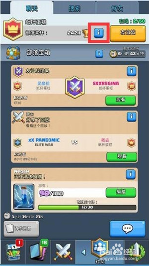 1、首先打開皇室戰(zhàn)爭,然后點擊下圖中箭頭標注的位置。