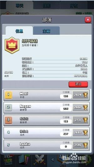 4、這里在跟大家說說怎么退部落。部落活躍的人少了,為了發(fā)展就要找一個更好的部落。點擊紅框中的倒嘆號,進入到部落信息界面,點退出按鈕就好了。
