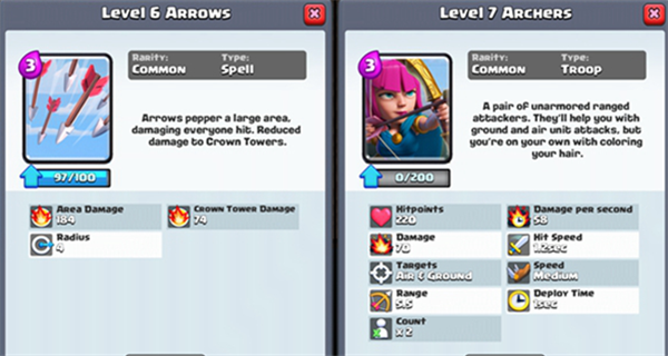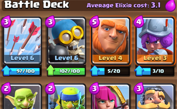 前期玩家遇到鋪場最強的卡就是召喚各式各樣的哥布林,能遇到進攻性最強的卡就是哥布林桶,但是這些卡有一個通病就是怕箭雨,箭雨能有效地克制這種低費的人海戰(zhàn)術。而弓箭手這個選擇,我相信不用說得太細,對天對地都有優(yōu)勢,而且本身性價比相當?shù)母?,配合哥布林投矛手可以輕松干掉各式各樣的近戰(zhàn)敵人。