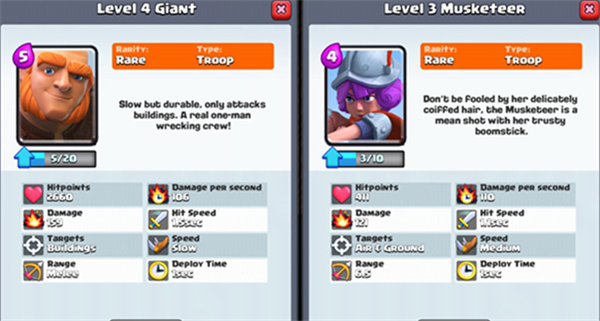 巨人是玩家前期唯一能夠獲得的一只坦克型攻城單位,可以有效地抗在隊伍的最前面吸收敵人的炮火,幫助自己后排的遠程單位拉扯出足夠的輸出空間。而火槍手則是前期最強的遠程單位,如果有幸抽多兩個火槍手的碎片把等級拉上去,則可以保證對手用火球術都無法清理,火槍日常任務基本就是在巨人扛著的情況下輕松單挑各類紫卡,是相當可怕的存在。
