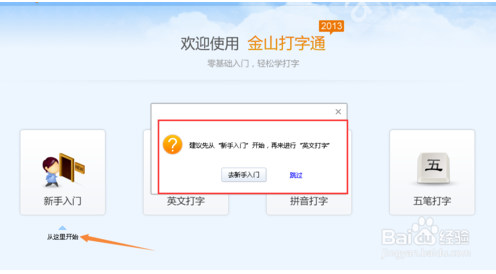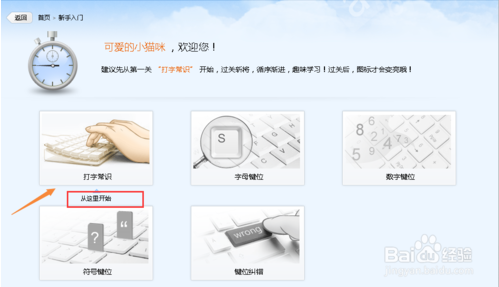 4、進來之后,會發(fā)現(xiàn)很多方式供你練習,不過在第一個下面倒也有提示,“從這里開始”,那我們就點擊這個吧,這里會教你認識鍵盤區(qū),了解的就不用看了,直接跳過