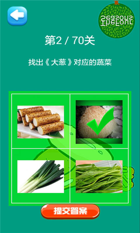 兒童教育,幼教啟蒙,智力開發(fā),親子教育, 認(rèn)識(shí)蔬菜,通過看圖猜物的形式了解常見蔬菜,包含70種蔬菜,讓兒童在玩游戲的同時(shí)認(rèn)識(shí)蔬菜,免掉枯燥乏味的學(xué)習(xí)過程 點(diǎn)擊開始游戲,根據(jù)提示,從四副備選圖中選出對(duì)應(yīng)的蔬菜,只要你了解每一種蔬菜,通關(guān)是沒有問題的,蔬菜大作戰(zhàn),邊玩邊認(rèn)識(shí)各種蔬菜。