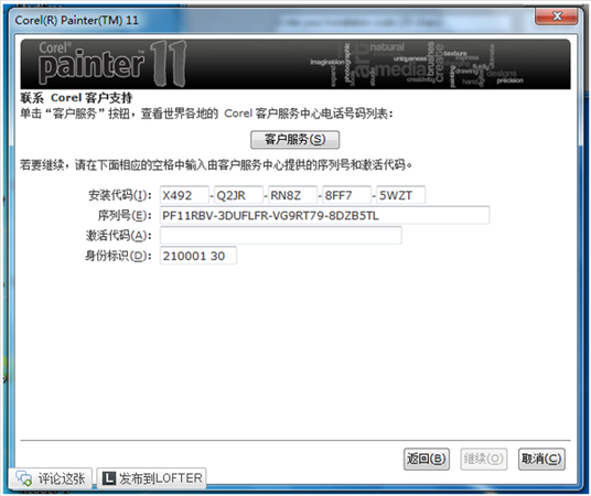然后裝好后軟件提醒要激活,在激活的界面選中間那個方式,好像是“致電corel”那個(忘記了……),然后就看到一個20chars的Installation code,復(fù)制到注冊機(jī)第二行,然后再generate一下,把生成的第三行激活碼粘貼進(jìn)去就好了