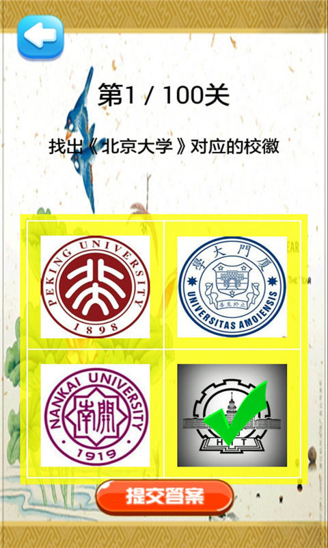 校徽大挑戰(zhàn)是一款休閑猜謎類游戲,游戲中收錄了全國(guó)一百所知名大學(xué)的?;眨婕倚枰鶕?jù)題目給出的信息,在系統(tǒng)給出的四個(gè)?;罩羞x出正確的一項(xiàng),非??简?yàn)玩家的觀察力與判斷力。