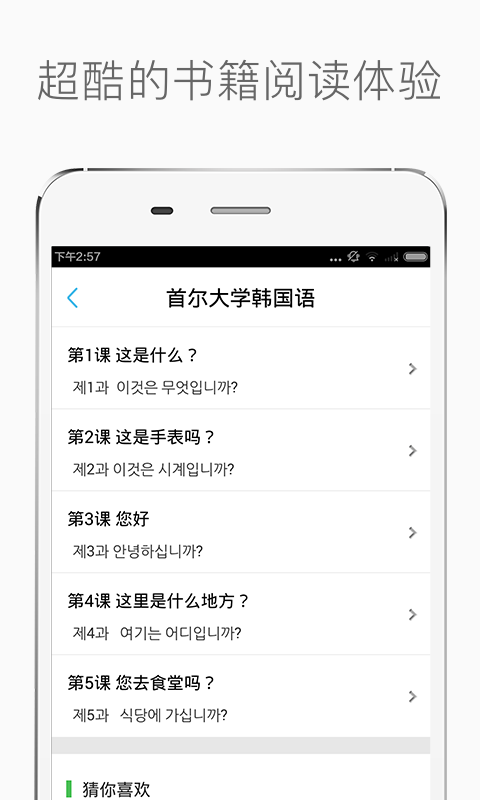 雙語對照,輕松理解各情景課文內(nèi)容;音頻播放,隨時(shí)隨地聆聽標(biāo)準(zhǔn)韓語發(fā)音;精講筆記,拓展延伸韓語語法知識。從易到難地介紹韓國語的語法體系和句子結(jié)構(gòu),選取日常生活中使用韓國語的實(shí)際情景編排課文內(nèi)容,在輕松不枯燥的學(xué)習(xí)過程中培養(yǎng)零起點(diǎn)學(xué)習(xí)者日常生活中必備的基礎(chǔ)韓語溝通能力。在線教育國民品牌-滬江網(wǎng),提供優(yōu)質(zhì)完善的在線教育服務(wù),豐富多彩的課程涵蓋各類學(xué)習(xí)服務(wù),其中包括英語,日語,韓語,法語,各類方言及德法西泰小語種;大學(xué)CET考試,四級,六級,口語,聽力,新概念,商務(wù)英語,考研,口譯和出國留學(xué)相關(guān)的雅思,托福,SAT,GRE,同時(shí)也有完整的中小學(xué)教育,中考,高考課程。內(nèi)容涵蓋教育行業(yè)網(wǎng)校課堂,新東方,學(xué)而思,單詞之美,拓詞,詞管家,樂詞,金山詞霸,百詞斬,海詞詞典,扇貝單詞,有道詞典,不背單詞,知米背單詞,英語流利說,掌中英語,多鄰國,有道口語大師,英語魔方秀,口語圈,聽力口語教練,有道詞典,金山詞霸,海詞詞典,快快查漢語字典,新華字典,必應(yīng)詞典,百度翻譯,歐路詞典,漢語詞典,作業(yè)神器,猿題庫,學(xué)習(xí)寶,學(xué)霸君,作業(yè)幫,超級課程表,課程格子,我要當(dāng)學(xué)霸等同類型應(yīng)用。