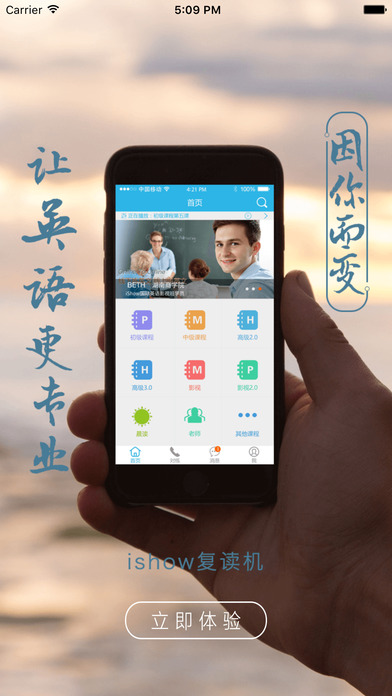 iShow復(fù)讀機(jī)app從2010年開始,iShow五年專注于大學(xué)生英語口語,從中國大學(xué)生口語現(xiàn)狀出發(fā),開創(chuàng)了獨具特色,iShow復(fù)讀機(jī)app把多種資源優(yōu)勢和專業(yè)訣竅有機(jī)結(jié)合起來,線上線下相結(jié)合,iShow復(fù)讀機(jī)app全力幫助大學(xué)生講一口流利的英語。