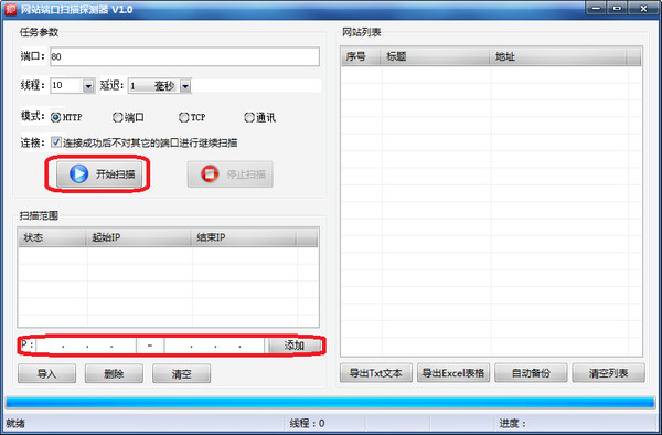 網(wǎng)站端口掃描探測(cè)器是一款支持批量IP段掃描探測(cè)網(wǎng)站的軟件,支持多線程快速掃描各種內(nèi)網(wǎng)雞外網(wǎng)IP地址探測(cè)出符合您指定規(guī)則的網(wǎng)站,同時(shí)可自動(dòng)備份掃描到的數(shù)據(jù)及支持批量備份導(dǎo)出文本文件和Excel表格。【使用方法】