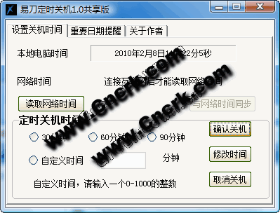 易刀定時(shí)關(guān)機(jī)系統(tǒng) V1.0 簡(jiǎn)體中文綠色免費(fèi)版 易刀關(guān)機(jī)軟件,界面簡(jiǎn)潔,功能穩(wěn)定;不占內(nèi)存,不影響電腦運(yùn)行速度;自定義關(guān)機(jī)時(shí)間,想是什么時(shí)候關(guān)就什么時(shí)候關(guān);支持電腦本地時(shí)間與國家標(biāo)準(zhǔn)授時(shí)中心進(jìn)行網(wǎng)絡(luò)時(shí)間校對(duì)。PS:由于網(wǎng)絡(luò)延遲的原因,你校對(duì)后的時(shí)間可能存在誤差1秒,