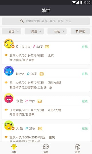 繁世app讓愛與智慧優(yōu)美的流動,希望通過我們精心打磨的產(chǎn)品,讓每個個體的價值得到更好的綻放。1:匯聚全國1000余所大學(xué)的學(xué)姐學(xué)長
