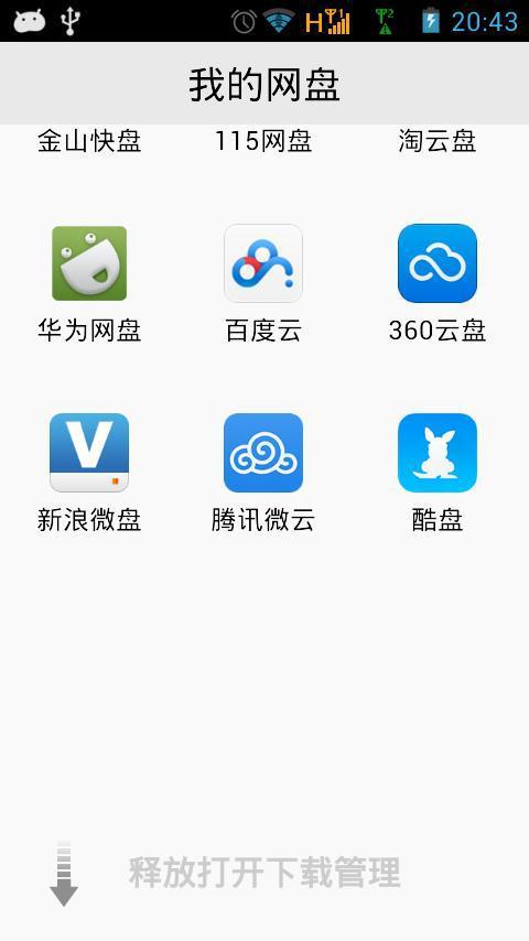 全網(wǎng)通用網(wǎng)盤實現(xiàn)了管理當下流行的各個網(wǎng)盤或云盤,本著“一個就夠”的原則,目前支持的網(wǎng)盤有:金山快盤,115網(wǎng)盤,淘云盤,華為網(wǎng)盤,百度云,360云盤、新浪微盤、騰訊微云,酷盤等。