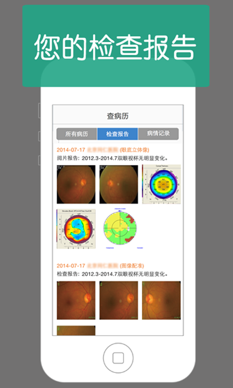 -支持查看眼底照相、OCT、眼前睫、視野計、眼AB超等眼科檢查項目報告;