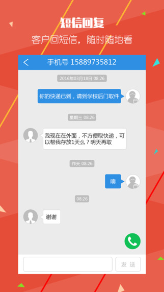 電話:簡便操作。收件:可以方便的記錄所有用戶的收件信息,不讓快遞員遺忘掉任何一條收件信息。