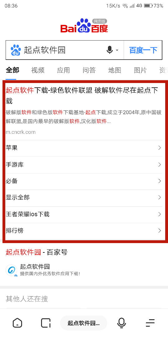 1.打開手機瀏覽器,搜索起點軟件園,點擊第一個進入起點