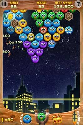 【游戲玩法】三只或三只以上同種顏色的小鳥聚在一起就會被消除掉!與市面上的泡泡龍游戲不同的是,只要玩家擊打到最后的房屋泡泡即可過關,不必全消。