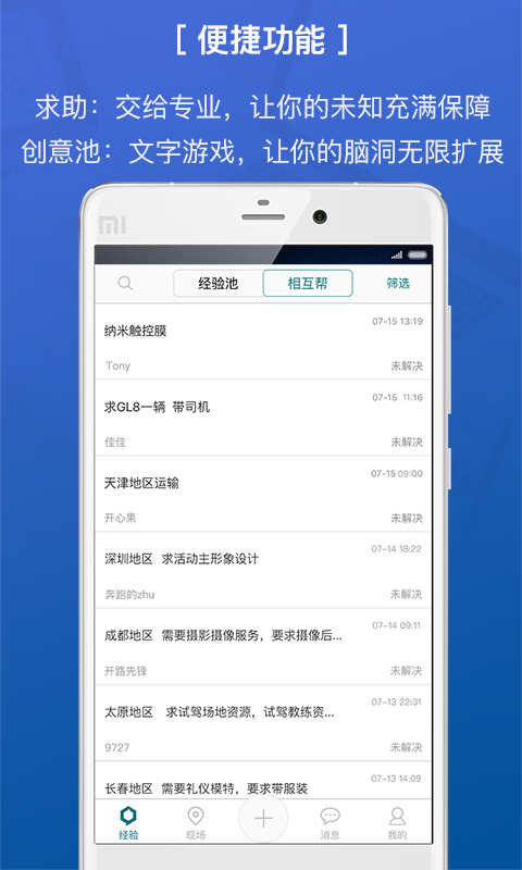 會E人app,今后還將上線其他的功能:o2o,培訓,教學,授課,供應,項目承接,循環(huán)合作,文化交流,社交等,為大家提供相應平臺服務如指南,市場,數(shù)據(jù),等服務,做一個新穎創(chuàng)新的渠道,我們的目標:傳遞經(jīng)驗,聚力改變!