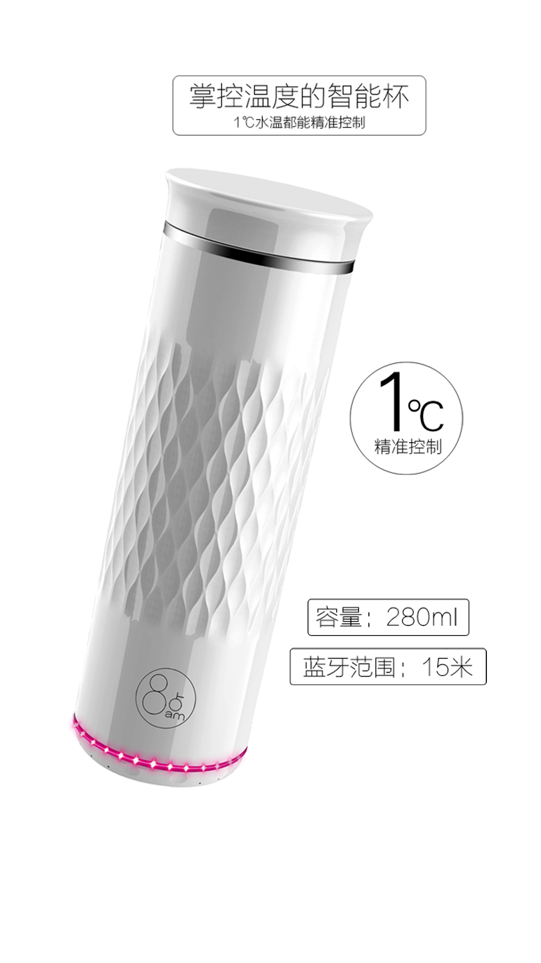 8點(diǎn)智能恒溫水杯,一款真正意義上的智能控溫水杯:1、恒定健康水溫:通過(guò)藍(lán)牙4.0連接手機(jī)APP,可根據(jù)每個(gè)人的體質(zhì)定制理想的溫度,永久恒定在此溫度上。