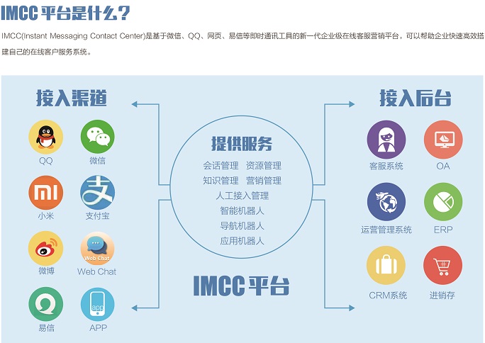 IMCC產(chǎn)品是目前整合互聯(lián)網(wǎng)渠道,國內(nèi)大中型企業(yè)使用最多的互聯(lián)網(wǎng)營銷服務(wù)平臺(tái)。平臺(tái)最初應(yīng)用于中國電信集團(tuán)企業(yè)QQ網(wǎng)絡(luò)客服系統(tǒng)。起初集成騰訊 QQ、MSN等互聯(lián)網(wǎng)聯(lián)絡(luò)工具,具備千萬會(huì)話并發(fā)控制能力,并在國內(nèi)承建首家企業(yè)級(jí)微信平臺(tái),還可以接入微博、淘寶等所有網(wǎng)絡(luò)聯(lián)絡(luò)工具。 IMCC作為營銷、客服全新的接入方式,將大量咨詢、投訴、訂購、推廣等業(yè)務(wù)轉(zhuǎn)移到互聯(lián)網(wǎng)新渠道,優(yōu)化企業(yè)內(nèi)部使用習(xí)慣,改善終端用戶使用體驗(yàn),最終提升用戶品牌,成就客戶!