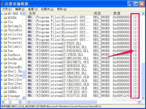 3,然后按“HKEY_LOCAL_MACHINE\SOFTWARE\Microsoft\Windows\CurrentVersion\SharedDlls”此路徑,定位于SharedDlls項。