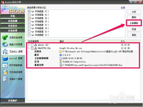 3,經(jīng)過一定時間的掃描分析后,就能找出無用的Dll動態(tài)鏈接庫文件,如果系統(tǒng)比較新,找出無用的Dll文件就比較少,我的系統(tǒng)只安裝了幾天,所以只找到了兩個,如果用的久,肯定會找出很多,找到后,按“全部刪除”按鈕進行清除。
