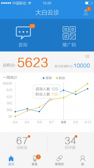 1.咨詢回復(fù):實(shí)現(xiàn)語(yǔ)音、文字和圖片實(shí)時(shí)溝通,自定義在線時(shí)間、快捷回復(fù)、病情備注、用藥助手等功能;2.患者管理:提供對(duì)患者的列表及分組管理,輕松查看患者健康檔案及康復(fù)情況,隨時(shí)追蹤患者病情發(fā)展;