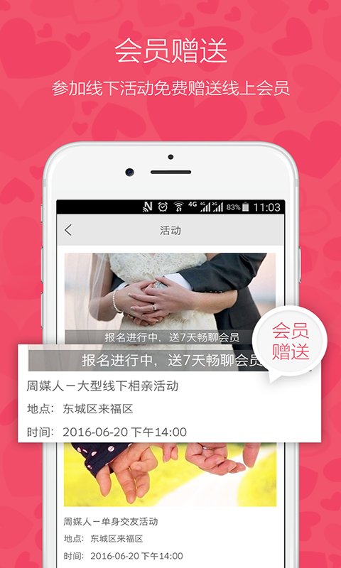 奇緣相親是一款集線上線下為一體的平臺(tái)化婚戀交友軟件,真實(shí)的呈現(xiàn)每次參加過(guò)活動(dòng)的會(huì)員信息,不用再擔(dān)心網(wǎng)絡(luò)上的用戶不真實(shí),我們的線下會(huì)員都來(lái)自每次的線下活動(dòng),只有參加了線下交友活動(dòng)才有能獲得我們的會(huì)員資格,這個(gè)資格可是花錢都不能購(gòu)買的哦。