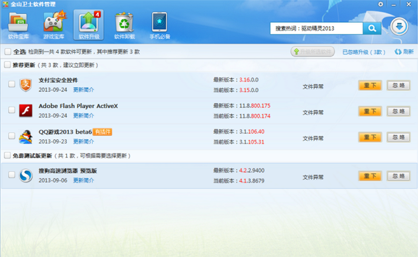 使用方法:打開金山衛(wèi)士百寶箱里的“軟件升級”,點擊“升級選中軟件”可一步將系統(tǒng)里面所有軟件升級到最新正式穩(wěn)定版(不會升級到Beta版)。