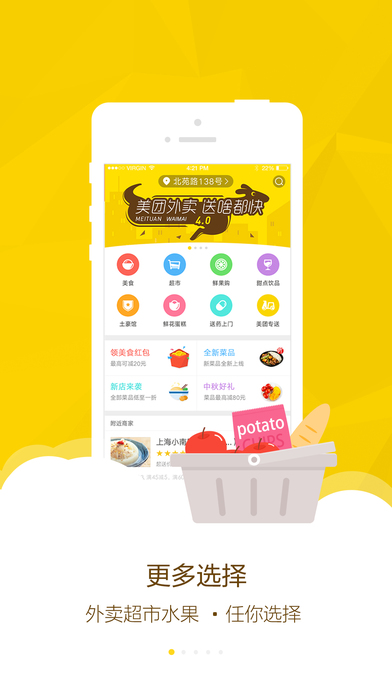 美團(tuán)外賣為您提供各類品牌外賣,美食商家訂餐服務(wù)。套餐優(yōu)惠,支付滿減,下單搶紅包優(yōu)惠更多,還送餐后飲料水果哦!用手機(jī)下單更優(yōu)惠,不出門不下廚房即可享受各地區(qū)特色美食外賣,天天都是美食節(jié)!