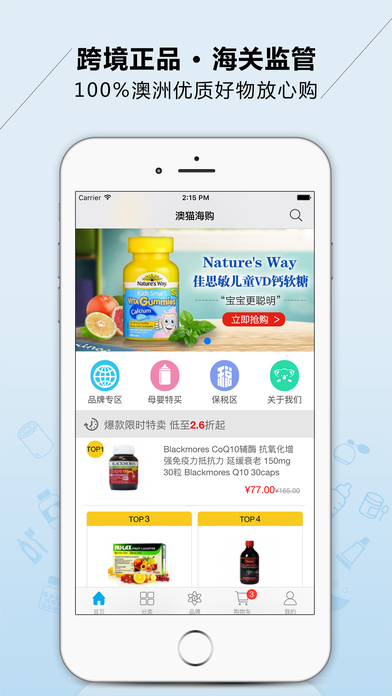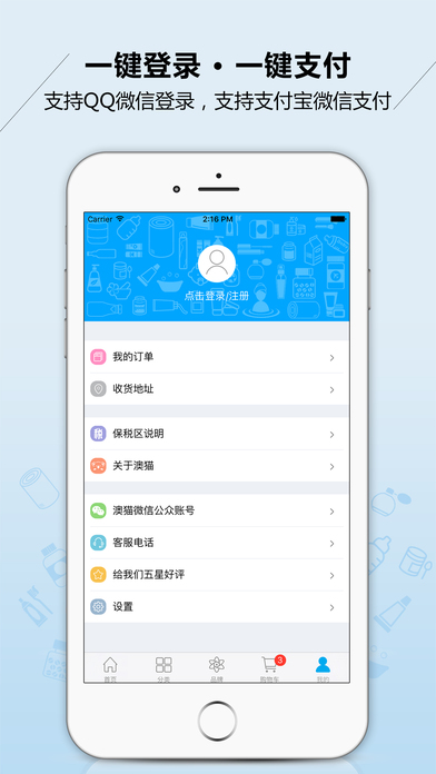 3.海購輕松下單:QQ、微信、微博直接登錄注冊,一鍵下單、支付寶、微信支付等多種支付渠道。國內保稅倉、海外直郵、香港倉儲等措施保障澳洲好貨快速到達您的手中。