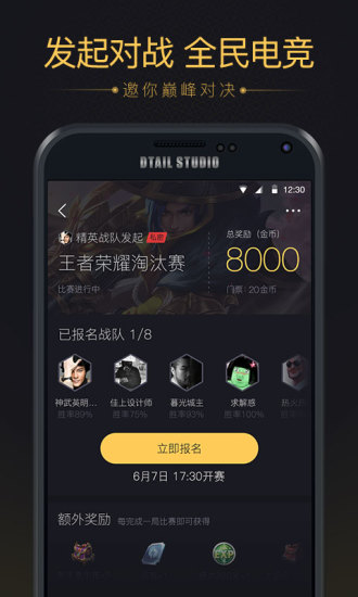 2、進入賽事頁面,用戶即可回播觀看各種精彩游戲賽事,同時還可以報名參加今天的直播賽事。