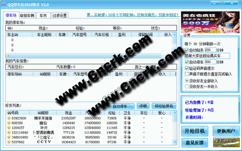 QQ停車位2012助手本軟件能自動(dòng)停車、自動(dòng)貼條、自動(dòng)買車、自動(dòng)舉報(bào)。讓你輕松游戲,享受生活。支持離線掛機(jī),關(guān)了電腦照樣掛!為您節(jié)省電費(fèi),減少電腦損耗 制作此軟件的目的主要是為了能更方便的停車,為您節(jié)約時(shí)間的同時(shí)給您的qq汽車帶來更高的贏利.有了此軟件您可以不用平凡的登陸qq空間來操作停車位.可以自動(dòng)停車,自動(dòng)貼條,自動(dòng)買車,自動(dòng)換車,一鍵停車. 此軟件為純綠色軟件,無須安裝,不包含任何插件甚至后門.您可以放心的使用本軟件. 主要功能: 1.【貼條】可以對(duì)選定的汽車進(jìn)行貼條 2.【停車】自動(dòng)挑選出一輛最合理的汽車停到指定車位上.減少操作步驟.使用更簡(jiǎn)潔 3.【舉報(bào)】可以舉報(bào)所有qq好友的汽車 4.【留言】不用登陸qq空間即可給對(duì)方進(jìn)行留言 5.【掛機(jī)功能】只要電腦開機(jī)時(shí)啟動(dòng)了掛機(jī)功能.那么就自動(dòng)為您操作你想操作的事件 6.【自動(dòng)停車】電腦自動(dòng)為您停車,更省心更省事.可以自己設(shè)定停車時(shí)間.比qq停車位托管更方便,還能幫您節(jié)約Money! 7.【自動(dòng)貼條】您想貼的都貼!不想貼的過濾掉即可.操作方便 8.【自動(dòng)購(gòu)買汽車】只要您還沒有10輛車時(shí),自動(dòng)為您購(gòu)買新車 9.【自動(dòng)換購(gòu)汽車】當(dāng)掛機(jī)時(shí),有足夠的錢換購(gòu)贏利更高的汽車時(shí),自動(dòng)為您換購(gòu)汽車.這樣為您的汽車帶來更高的贏利! 10.【一鍵換停汽車】您只需用鼠標(biāo)點(diǎn)一下,即可將所有汽車停到您想停的位置上!幾秒鐘即可操作完成!效率是手動(dòng)停車的幾十倍! 申明:本軟件為qq停車位第三方輔助軟件,完全免費(fèi),用戶請(qǐng)自己選擇是否要使用本軟件