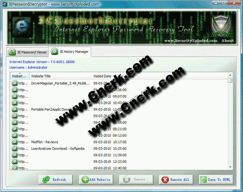 它還配備了獨特的特性,它允許用戶重置IE的分級審查密碼,如果用戶已失去了它。同時還介紹,IE瀏覽器歷史記錄管理器的接口,不僅顯示了詳細(xì)的IE瀏覽器歷史的內(nèi)容,還提供了選擇添加/刪除輕松的網(wǎng)站。