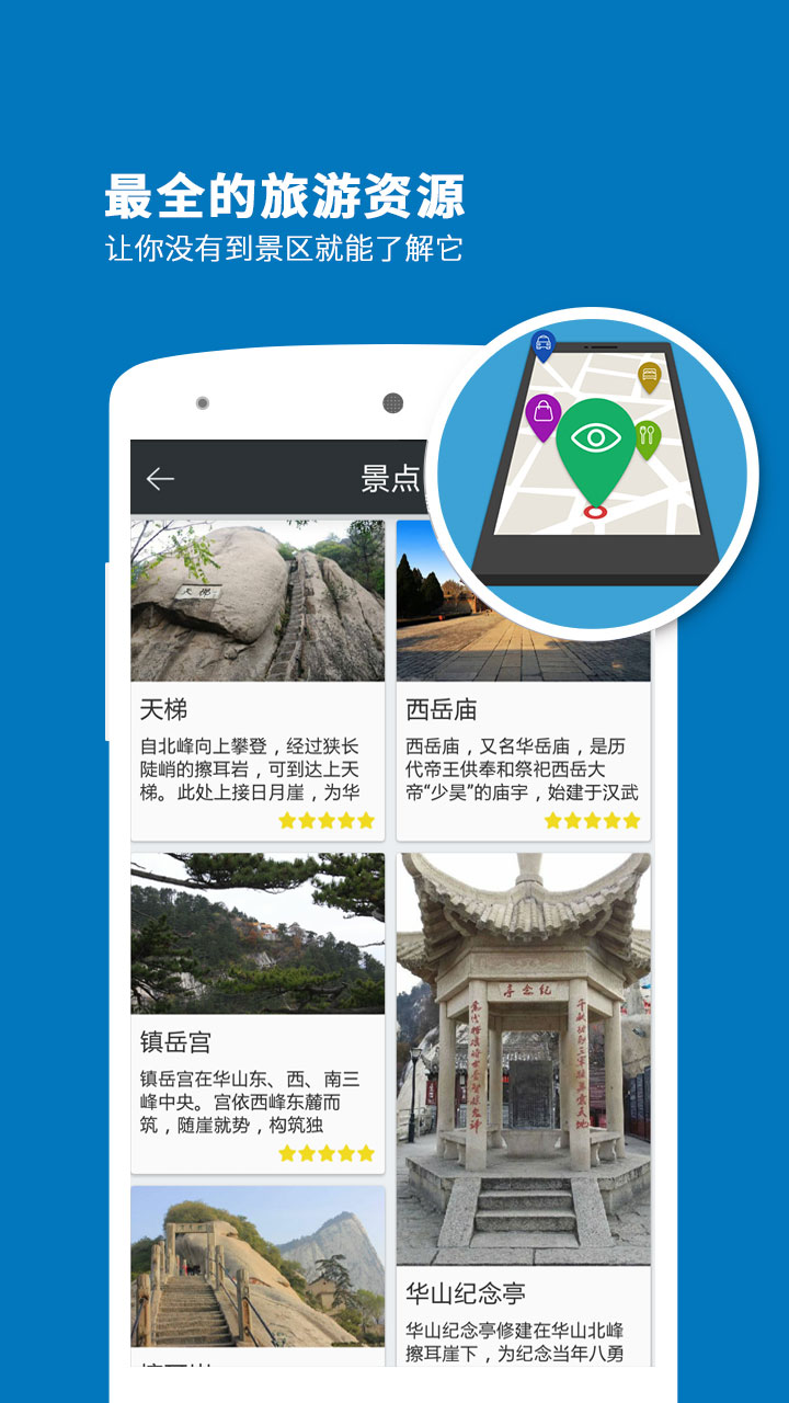 聽游天下——華山導(dǎo)游:專業(yè)的智能語音導(dǎo)游系統(tǒng),專為喜歡自由行的旅行愛好者而設(shè)計(jì)。攜手科大訊飛,帶給您獨(dú)特的華山印象。華山古稱“西岳”,為中國著名的五岳之一。位于陜西省渭南市華陰市,海拔2200米,秦、晉、豫黃河金三角交匯處,“遠(yuǎn)而望之若花狀”,故有其名。又因其西臨少華山,故稱太華山?!叭A山自古一條道”,由北向南,貫穿北峰、中蜂、東蜂、南蜂、西蜂計(jì)程越20公里。一路行去必經(jīng)千尺幢、白尺峽、老君梨溝、上天梯、滄龍嶺等絕險要道,可包嘗華山之險。若親臨其境奇峰峭壁,險徑危石,鬼斧神工必令游者不勝驚駭,嘆為觀址。素有“奇險天下第一山”之稱。