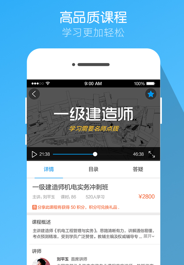 1、優(yōu)質(zhì)課程:建筑職業(yè)教育權(quán)威專家,結(jié)合行業(yè)精英考試經(jīng)驗,保證視頻課程的教學(xué)質(zhì)量,隨時隨地都能看到名師的好課;
