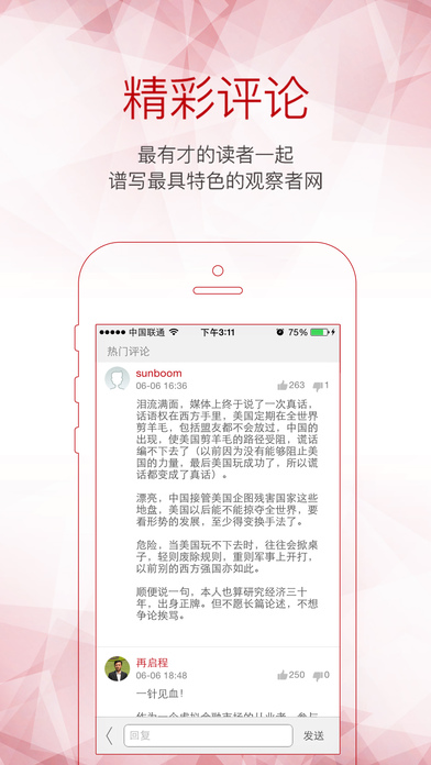觀察者網(wǎng)關(guān)注社會時(shí)事,也從不錯(cuò)過互聯(lián)網(wǎng)熱點(diǎn)。已經(jīng)發(fā)生的,正在發(fā)生的,最新鮮,最好玩的事,我們?nèi)轿坏某尸F(xiàn)給讀者。更有張維為、林毅夫、張文木等眾多專家學(xué)者的智慧在這里碰撞。大學(xué)生、公務(wù)員、白領(lǐng)、藍(lán)領(lǐng),關(guān)心中國崛起的讀者都能在這里獲得共鳴。