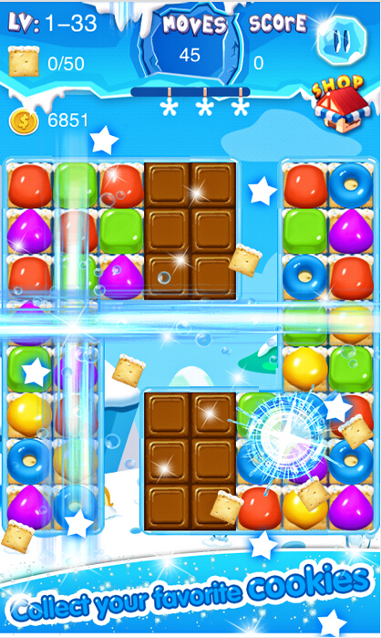 餅干瘋狂是一款休閑消除類(lèi)游戲,采用經(jīng)典的三消玩法,玩家在游戲中要通過(guò)手指滑動(dòng)屏幕,將三個(gè)或三個(gè)以上顏色相同的餅干相連即可達(dá)成消除,每個(gè)關(guān)卡都有固定的分?jǐn)?shù),只有達(dá)到條件才能成功過(guò)關(guān)。