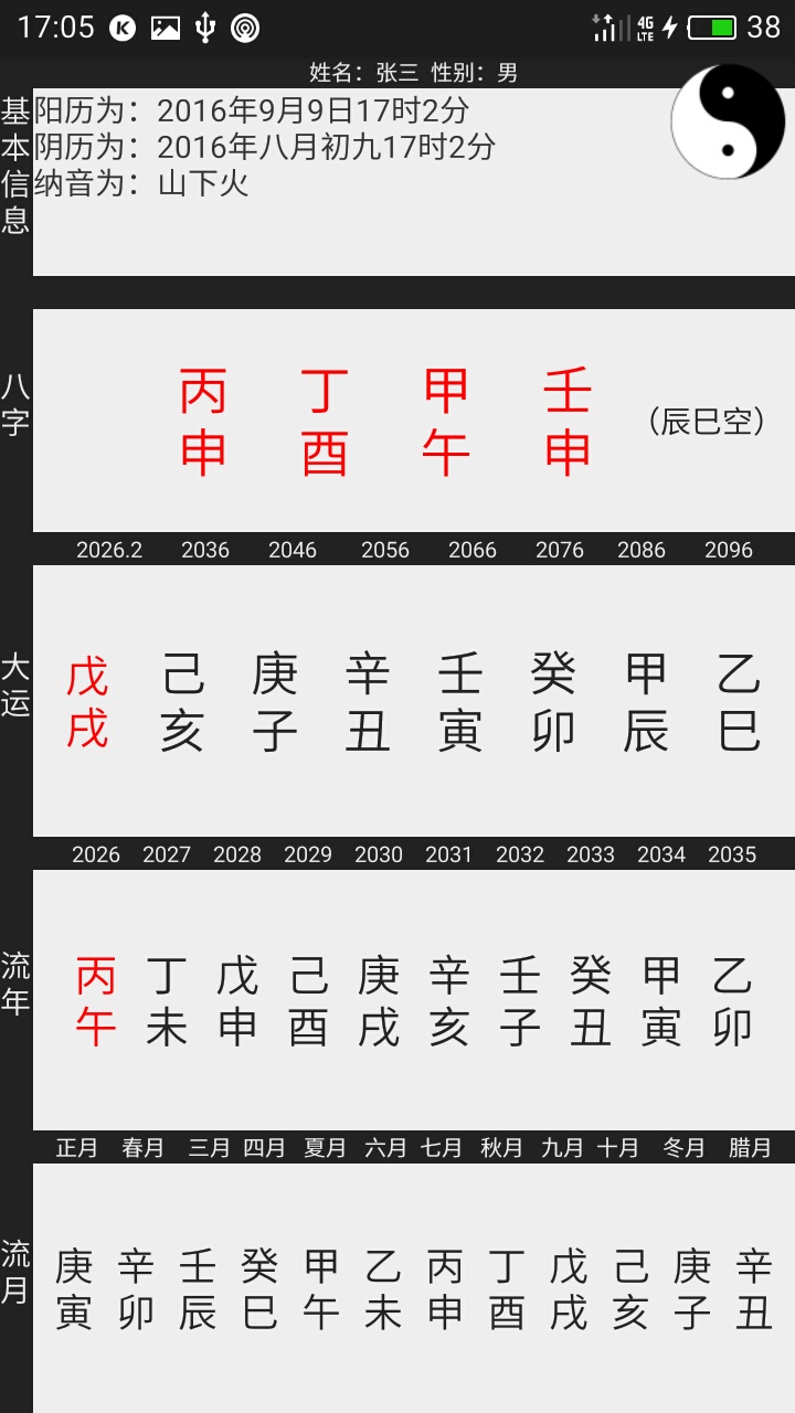 4.排流月:通過(guò)用戶點(diǎn)擊相應(yīng)的流年,來(lái)顯示相對(duì)應(yīng)的十二個(gè)流月(從寅月開始顯示)。
