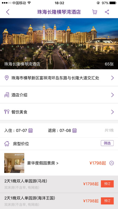 更即時和便捷地瀏覽、預(yù)訂酒店,購買門票。 實時同步最新酒店客房狀態(tài)信息,好房間不會錯過。在線購買門票,獲取預(yù)訂二維碼,直接入場,省去現(xiàn)場排隊購票的麻煩,讓您更輕松。