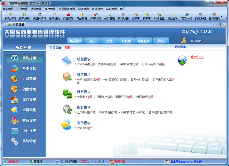 1、支持POS銷售??梢愿鶕?jù)需要選配打印機(jī)、讀卡器、會(huì)員卡、條碼槍、錢箱、顧客顯示屏及小票打印機(jī);可以根據(jù)自已喜好設(shè)計(jì)各種有特性的打印格式。銷售時(shí)可以適時(shí)掌握每一個(gè)商品的當(dāng)前庫存數(shù),銷售成本、銷售毛利;2、支持會(huì)員管理??稍O(shè)置會(huì)員級別,不同級別可以適用不同的價(jià)格與折扣.可以自動(dòng)計(jì)算會(huì)員的累計(jì)消費(fèi)、累計(jì)積分、兌現(xiàn)積分及剩余積分情況。過生日的會(huì)員可自動(dòng)提醒;