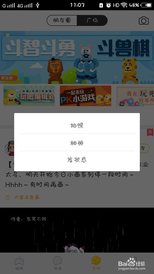 接著,會彈出一個框供你選擇,我們如果發(fā)動態(tài)的話就點一下最后一個“發(fā)狀態(tài)”,就會進入到發(fā)狀態(tài)的頁面。