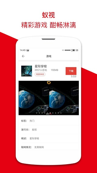 蟻視VR,完美支持大部分虛擬現(xiàn)實設備。提供了大量的虛擬現(xiàn)實游戲,您可以佩戴上蟻視公司的機饕利用手機體驗360°的虛擬現(xiàn)實游戲,享受身臨其境的感覺。