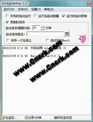 鍵盤記錄小秘書是無毒免殺的免費(fèi)軟件,用于家長監(jiān)控孩子上網(wǎng),監(jiān)控個(gè)人電腦是否被他人盜用??捎涗洷槐O(jiān)控電腦的所有鍵盤、鼠標(biāo)操作,(包括QQ賬號(hào)密碼;游戲賬號(hào)密碼等;QQ、msn等聊天記錄;所有瀏覽過的網(wǎng)頁、瀏覽過的文件夾記錄和打開的視頻等信息)。并可保存為文件,定時(shí)發(fā)送到指定的郵箱內(nèi)。請(qǐng)不要用于非法用途,否則后果與自負(fù),作者不承擔(dān)任何法律責(zé)任!