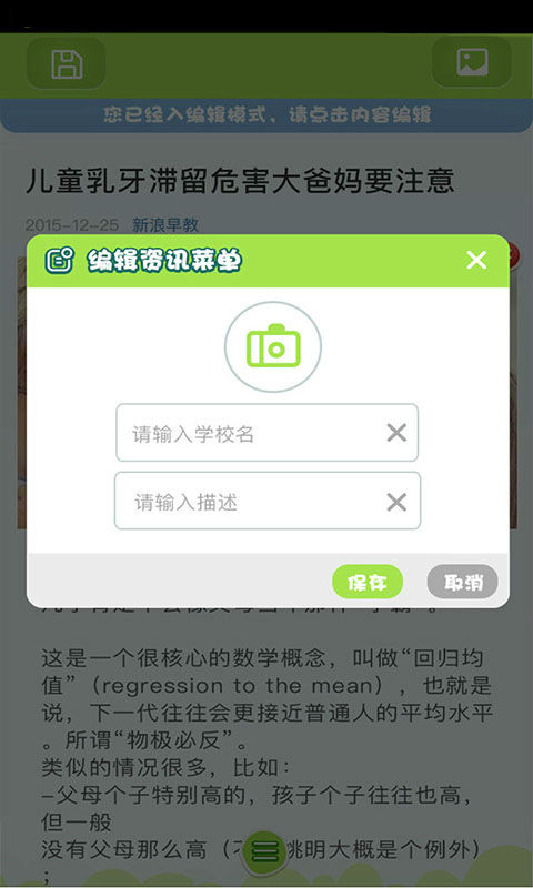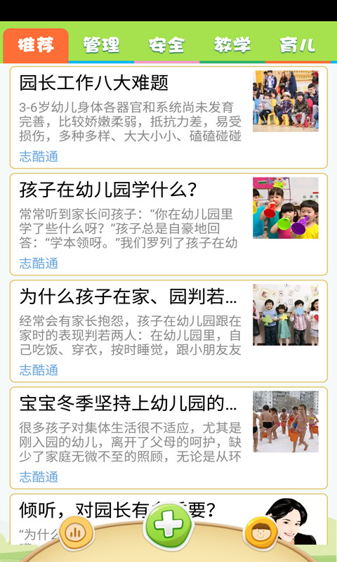 園長(zhǎng)頭條app,提供包括管理、安全、教學(xué)、育兒、活動(dòng)、評(píng)估等資訊。以一站式服務(wù),每日精心為你推薦所感興趣的資訊。并且可以快速創(chuàng)建圖文,記錄您的心得、經(jīng)驗(yàn)、園所活動(dòng),以及幼兒園招生簡(jiǎn)章,還可以一健分享至微信好友、朋友圈,與同行、好友、老師、家長(zhǎng)分享你對(duì)幼兒園滿滿的愛。【更新日志】
