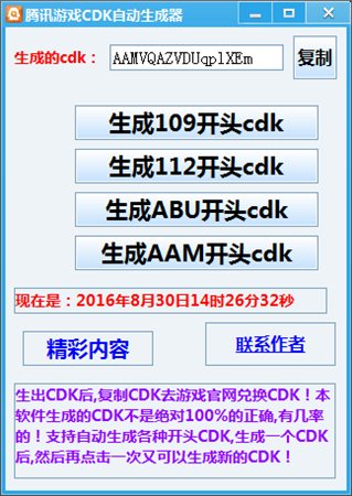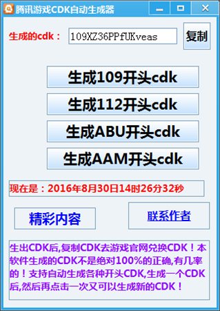 騰訊游戲CDK生成器是一款針對(duì)騰訊旗下游戲所推出的CDK生成器,該軟件能夠通過(guò)隨機(jī)的算法計(jì)算出騰訊的CDK值,生產(chǎn)出的CDK可去游戲官網(wǎng)兌換英雄聯(lián)盟皮膚、CF槍械等,非常實(shí)用!