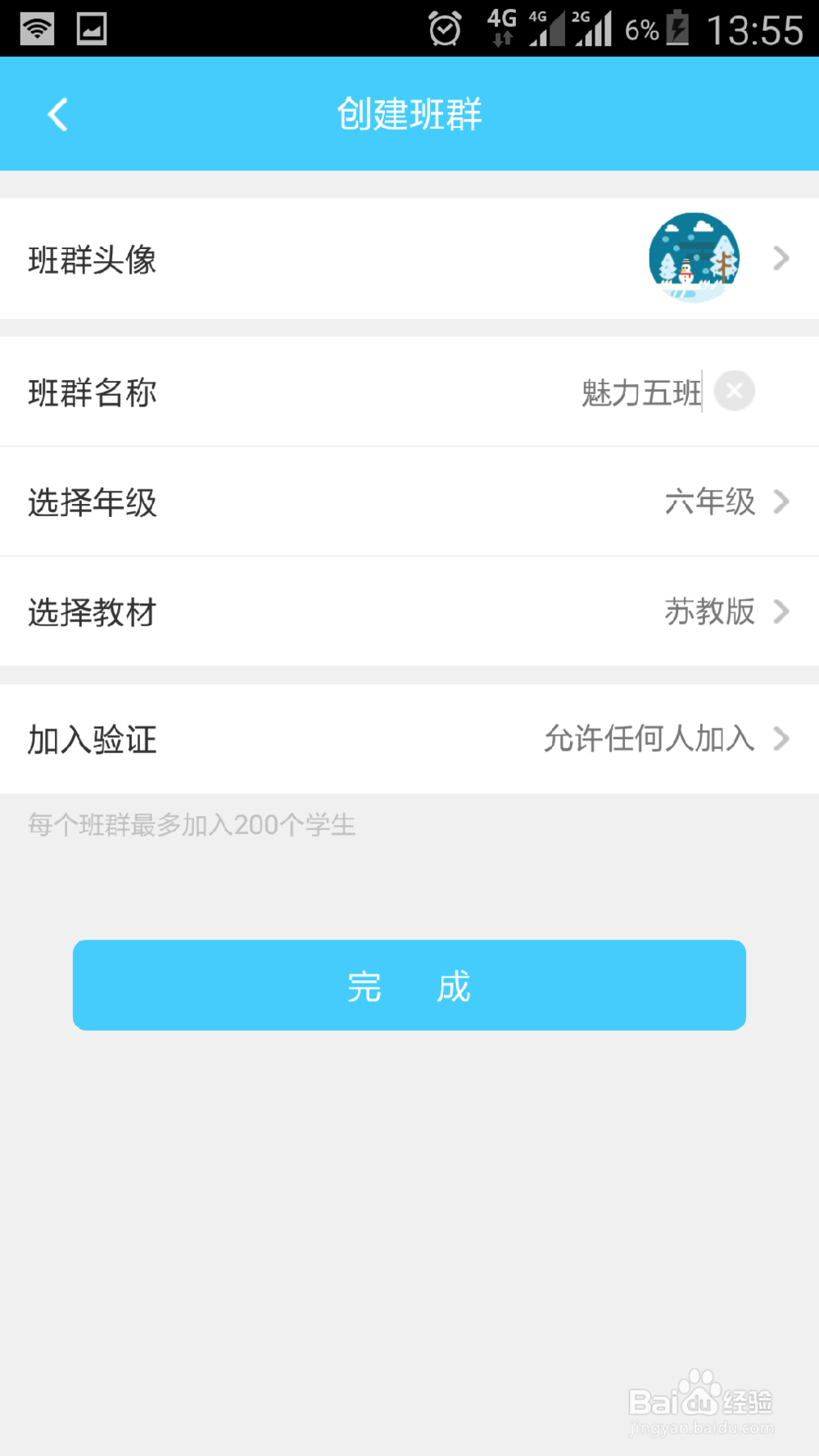 選擇一個班群圖像,輸入班級名稱,并且選擇年級、教材和加入驗證的方式。如圖所示: