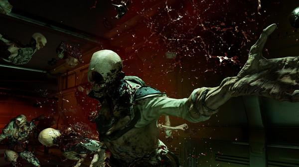 3,從另一個(gè)方向的門(mén)前行,打開(kāi)門(mén)會(huì)看到會(huì)自爆的惡靈,我們可以打遠(yuǎn)邊的炸藥桶或者提前將其消滅。通道出來(lái)是一片較大的區(qū)域,這里會(huì)要求玩家先把敵人全部消滅。