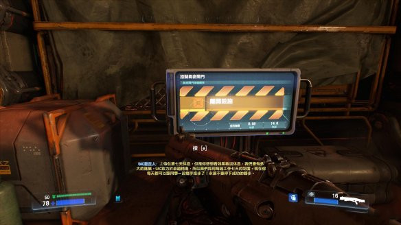 上面能看到一個(gè)UAC發(fā)言人的虛擬影像,洗腦般的吹噓UAC的功績(jī)以及瘋狂的壓榨人員的工作時(shí)間。我們只需從里面房間里的控制氣密閥門(mén)的開(kāi)關(guān)上點(diǎn)擊離開(kāi)設(shè)施,即可完成任務(wù)。