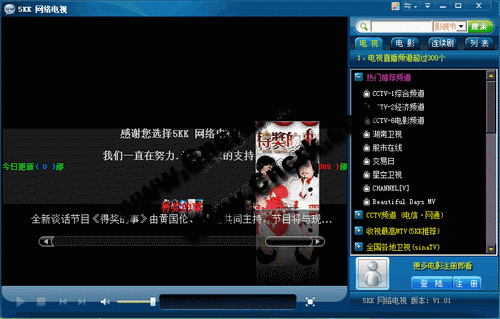 5KK 網絡電視直播軟件,支持對海量高清影視內容的“直播+點播”功能。 它具有高清電影功能,高清電視直播頻道,多個服務器選擇,讓您看電視,看電影不再卡.