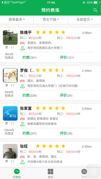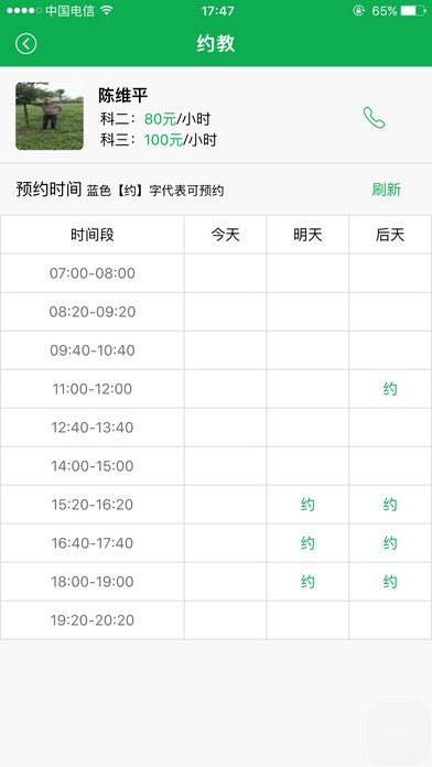 4.進(jìn)入教練信息界面,此界面中有教練各項(xiàng)信息;選擇訓(xùn)練的科目,進(jìn)入約教界面;